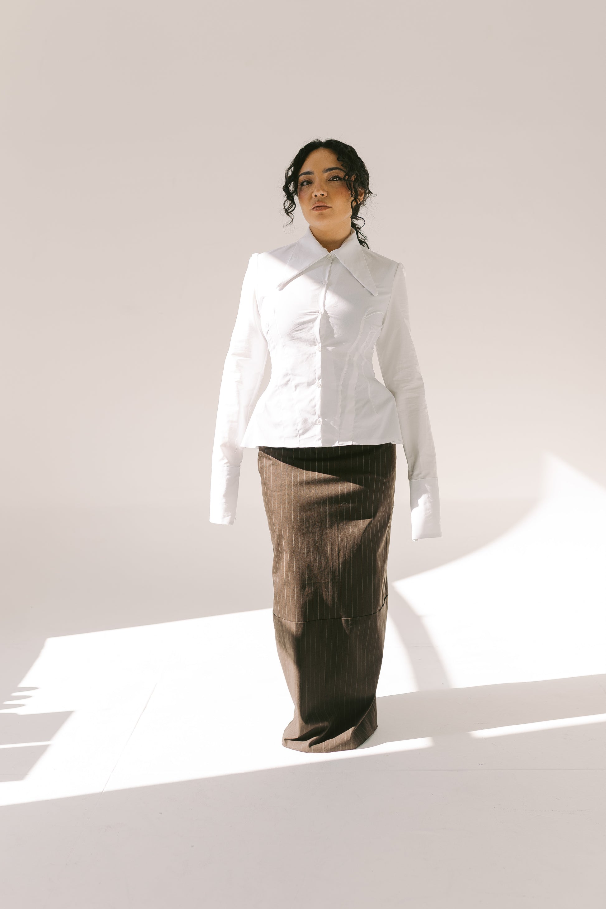 Stitched detailing contouring at the torso with pointed collar and button front closure.